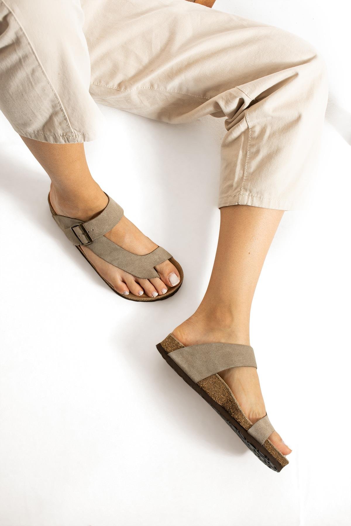 Dubai Hakiki Deri Mantar Taban Ortopedik Unisex Terlik - Süet Taupe