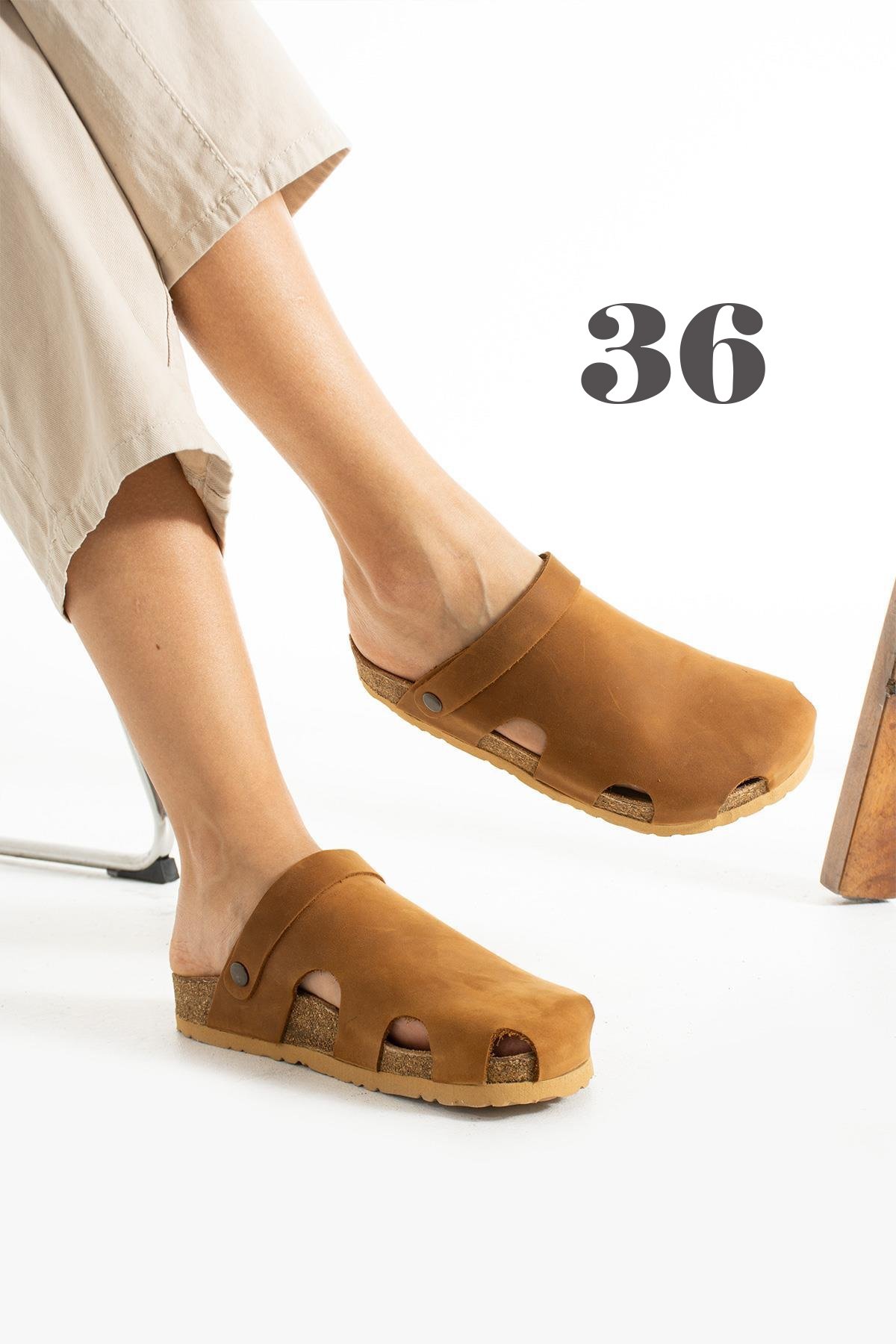 Dublin Hakiki Deri Mantar Taban Ortopedik Unisex Terlik - Crazy Taba-3626