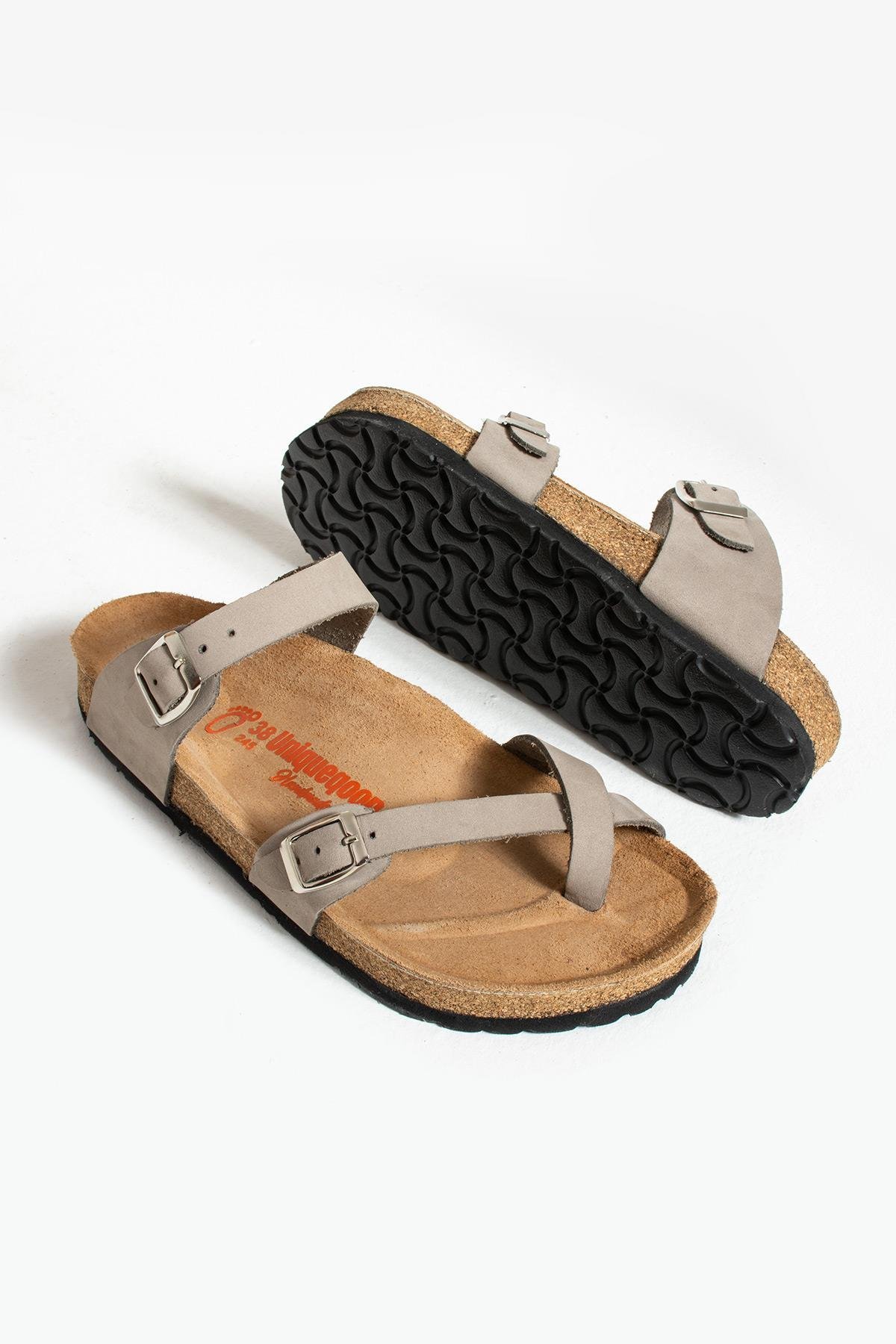 Lisbon Hakiki Deri Mantar Taban Ortopedik Parmak Arası Kadın Terlik - Taş Rengi