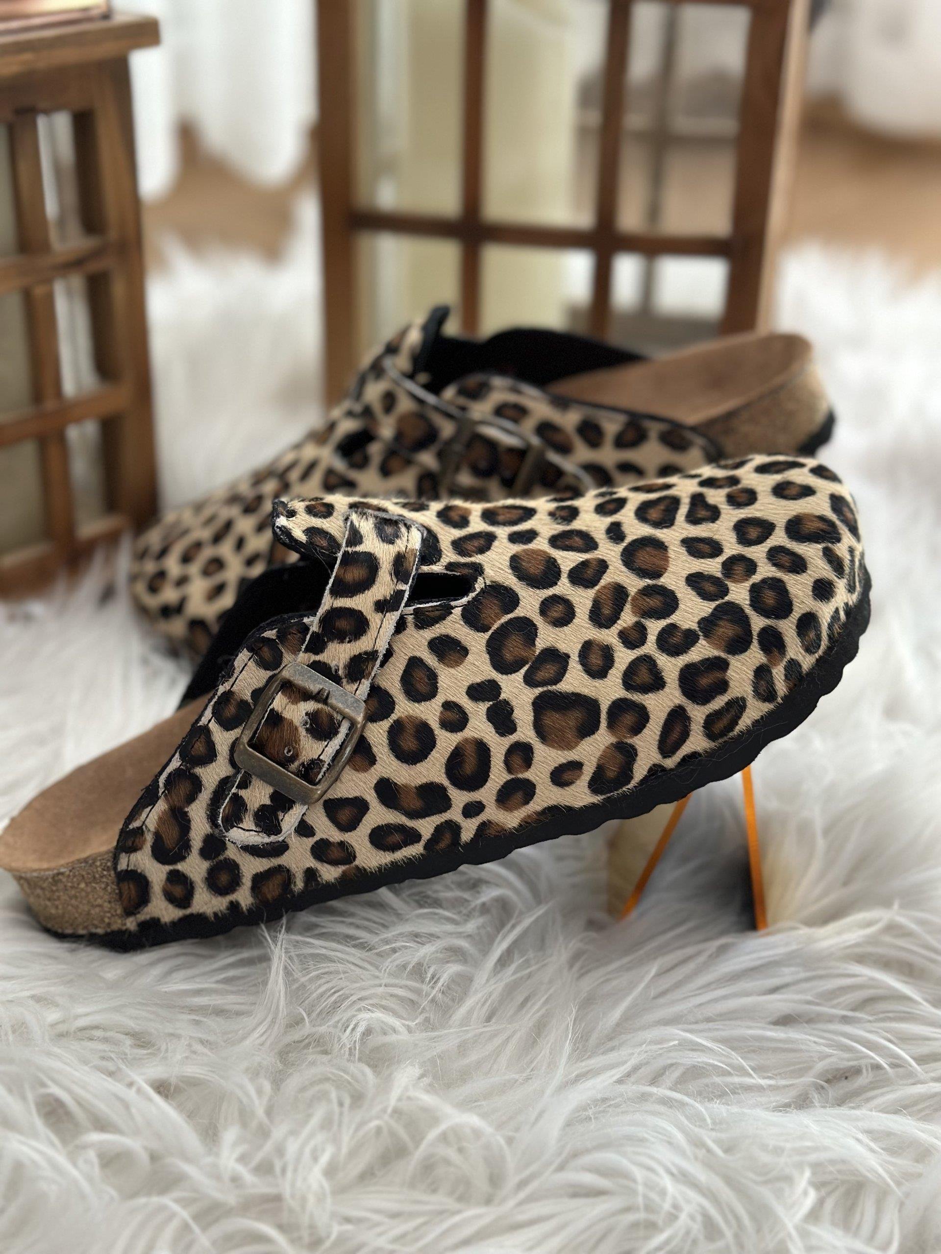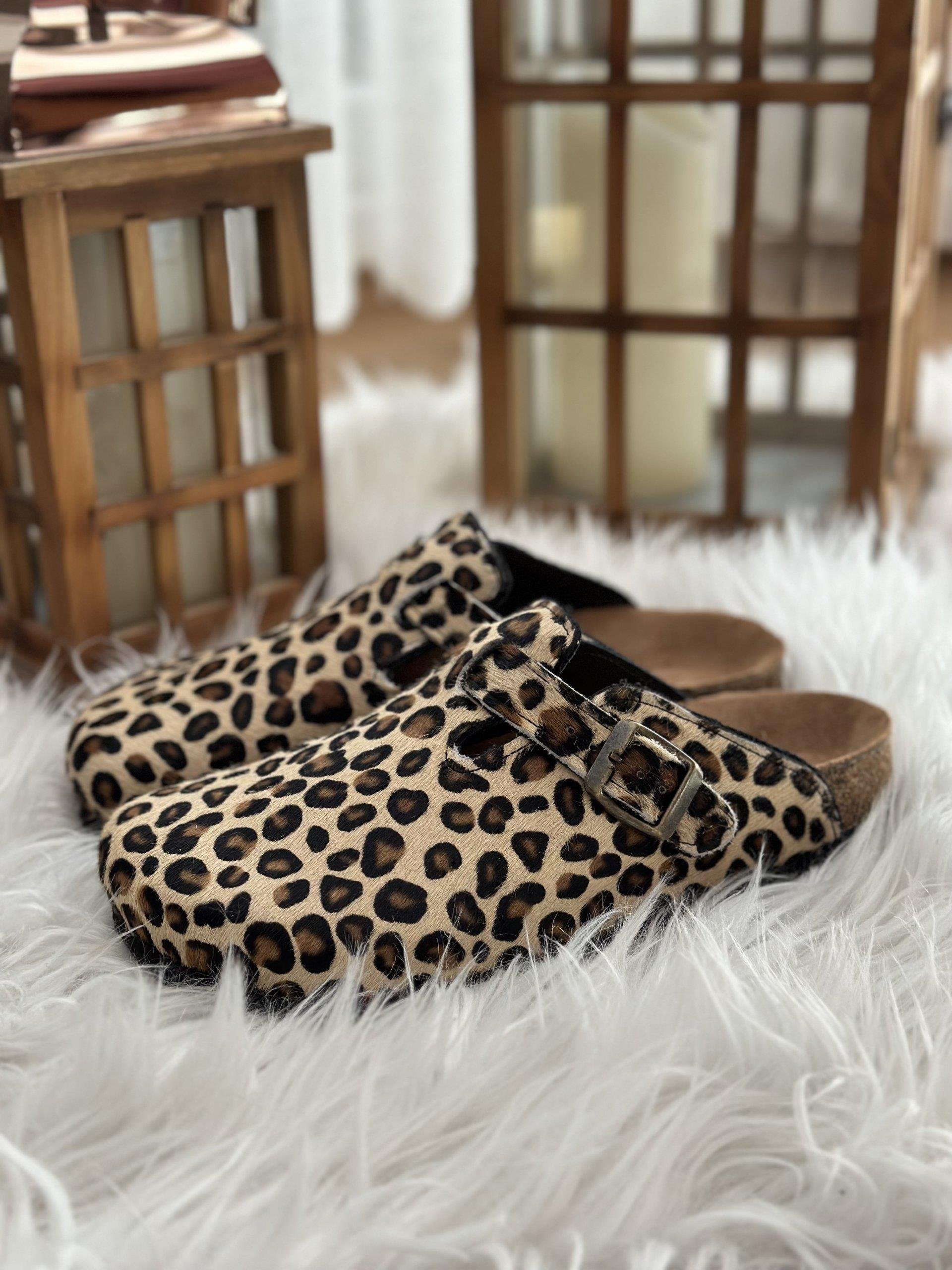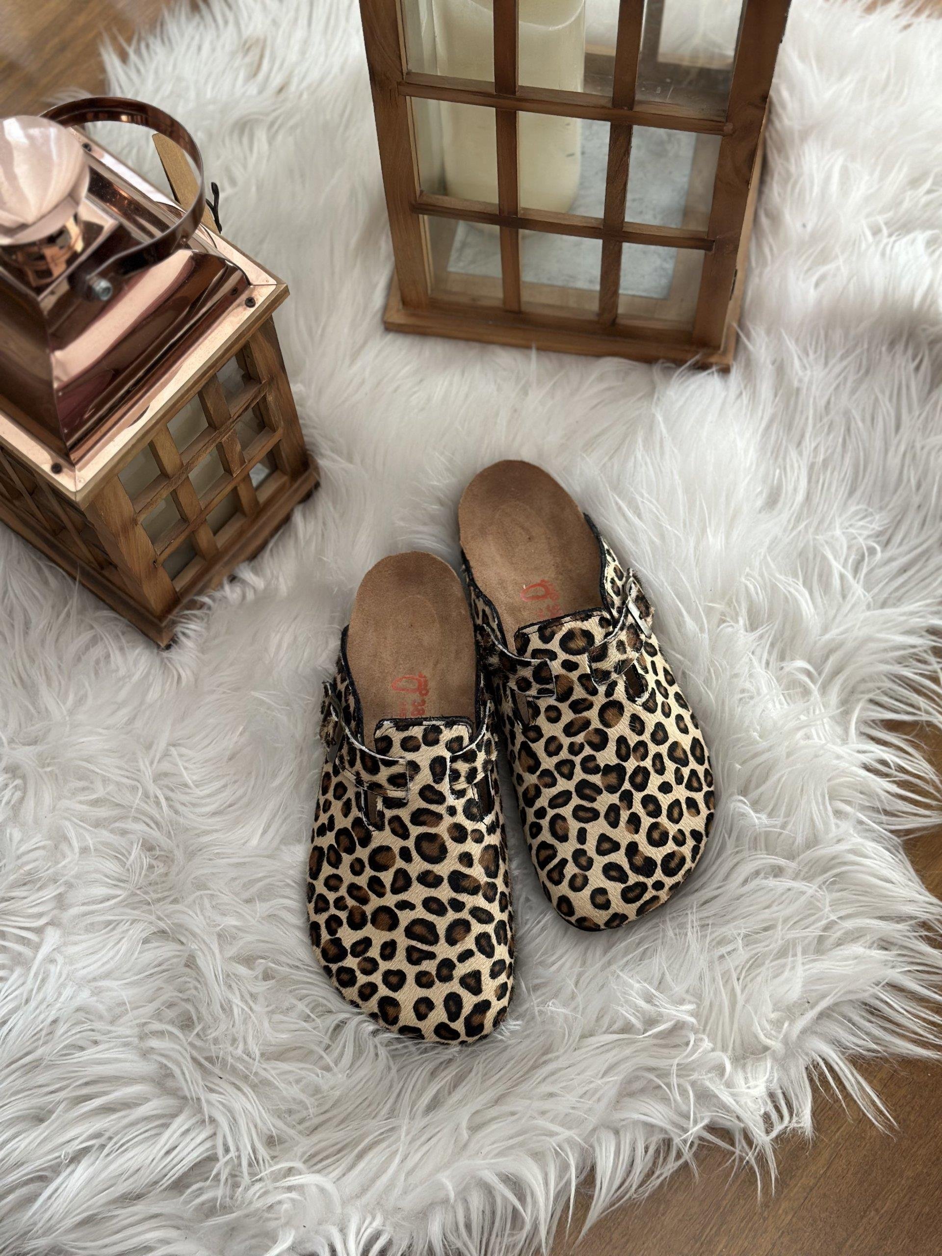 Oslo Hakiki Deri Mantar Taban Ortopedik Kadın Terlik - Leopar